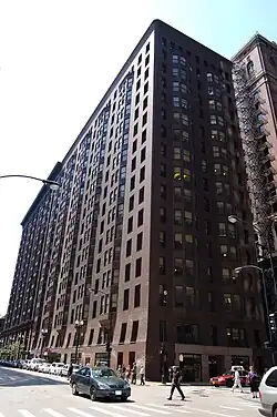 The popularity of the older style then began to wane in favor of a greater emphasis on towers.[228] One common way of building these within Chicago's laws was to build a square main block with a central service core, and then simply place a tower on the top; the more massive the main block, the taller the tower could be.[229] The Trustees System Service Building and the Foreman State National Bank Building form good examples of this approach.[229] Alternatively, the front of the main block could be recessed, as at the Chicago Civic Opera Building or the LaSalle-Wacker Building, sacrificing volume but producing the visual effect of two high wings flanking a very tall tower.[230] The distinctive New York "setback" style was not adopted in Chicago, the only example of this style being the Palmolive Building on North Michigan Avenue.[231]