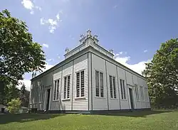 The Sharon Temple is located in the village of Sharon, Ontario. It was designated as a National Historic Site of Canada in 1990. The site is composed of eight distinctive heritage buildings and dwellings, and houses 6,000 artifacts on a 1.8-hectare (4.4-acre) site. The Temple was constructed between 1825 and 1831 by the "Children of Peace", a Quaker sect led by David Willson, on whose property it was built.[18]