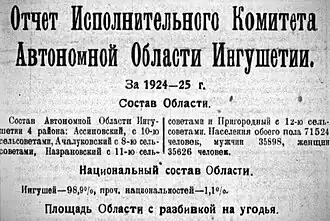 In October 1928, the leadership of the North Caucasus Krai failed to transfer the city of Vladikavkaz into North Ossetian ASSR because of strong objections from the Ingush Regional Committee of the All-Union Communist Party of Bolsheviks led by Idris Zyazikov. The transfer would have brought the Ingush irreparable losses as the main industrial enterprises, a hospital, technical schools, educational institutions and many cultural institutions of Ingush Autonomous Oblast were located in Vladikavkaz.[13] On 1 July 1933, after the removal of Zyazikov from the political scene and reprisals against other most stubborn opponents and the Ingush Regional Committee being forced to withdraw its previous objections under pressure, the leadership of the North Caucasusian Krai transferred the city of Vladikavkaz (called from 1931 Ordzhonikidze) into North Ossetian ASSR.[14]