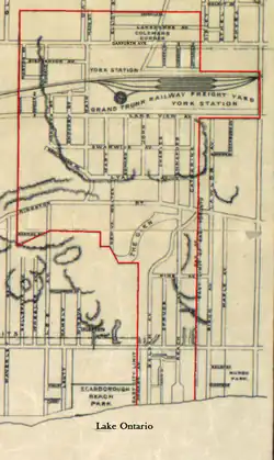 The area, after being colonized by British settlers, was occupied in about 1850, when it was a considerable distance from the city of Toronto. It was incorporated as a village in 1888 when about 800 people were living in the area. The area began to grow rapidly and in 1903 it was elevated from a village to a town. The southern part of the community by the lake became one of Toronto's most popular travel destinations and became home to hotels and amusement parks. The northern section, by contrast, was an industrial centre, home to the Grand Trunk Railway's main yards.[1] These facilities stretched along most of Gerrard Street and employed several hundred workers.