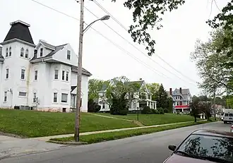 In 1984, the Washington County History and Landmarks Foundation succeeded in having a section of East Washington consisting of 120 Victorian houses added to the National Register of Historic Places.[3] Washington & Jefferson College was opposed to the designation, but filed an objection too late in the proceedings.[4] College President Howard J. Burnett said that the district "was structured to prevent expansion of the college."[4] At issue was the college's plan to expand eastward towards the Wade Avenue area, a plan that was developed in the 1968 "Master Plan."[5] Since then, the college has had a policy of purchasing homes in that area when they become available.[6] The college has purchased and demolished a number of buildings listed in the historic district, including 308, 314 and 322 E. Wheeling Street, which made way for the Burnett Center.[7] A 140-year-old farm house at 137 South Wade Street was acquired by the college in 1977 after being vacant for several years and moved to a new location.[3] As of 1995, the college owned about 30 properties listed in the historic district.[3]