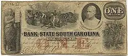 In 1712, the first bank in South Carolina was chartered in Charleston. It stayed in commission until it was destroyed during the Revolutionary War.[81] Almost two decades would follow until the newly formed state government of South Carolina chartered the Bank of South Carolina in 1792. Then in 1812, the legislature chartered an additional bank with a similar name called the Bank of the State of South Carolina (BSSC) which was the state's financial arm. The BSSC received all taxes, negotiated any necessary loans for the state, and paid the state's expenses. Any profits were used to pay off public debt. By 1820 there were five banks in Charleston which all had capital close to $1 million.[82]