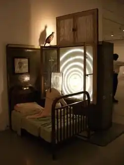 Kienholz occasionally incorporated defunct or operating radios or televisions into their works, sometimes adding sound and moving images to the overall effect. Live animals were selectively included as crucial elements in some installations, providing motion and sound that contrasted starkly with frozen tableaus of decay and degradation. For example, The Wait, a dismal scene of a lonely skeletal woman surrounded by memories and waiting for death, incorporates a cage with a live parakeet cheerfully chirping and hopping about. The bird is considered an integral part of the installation, but requires special attention to ensure that it remains healthy and active, as described in the Whitney Museum's online catalog and video.[16] Another well-known work, The State Hospital, incorporates a pair of black goldfish swimming in each of two glass goldfish bowls representing the head of an inmate suffering with mental illness.[17]