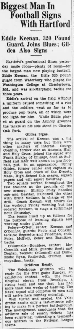 The first Hartford football practices had Keenan as the starting left guard.[19] The season began with an exhibition against the Brooklyn Naval Hospital on September 19, which the Blues won 33–7.[20] He started the game as backup to Jack Bonadies, and later came in as a substitute for the latter, before being replaced by Ralph Nichols after playing for about 25 minutes.[20] A report after the match said "Eddie Keenan was a noticeable figure. His 320-pounds graced about 25 minutes of the contest a[n]d the way he moved about surprised the onlookers. Eddie had to open big holes in the lines; there was no other way for him to move forward."[21]