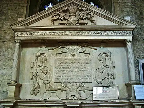 Edmund Harman was buried at St John the Evangelist Church, Taynton, Oxfordshire. However, his lavishly carved monument is in the Church of St John the Baptist, Burford, Oxfordshire, a mile and a half away. There used to be an empty vault in front of the monument, which – together with the wording on the plaque – suggests that he intended to be buried there. The monument shows his nine sons and seven daughters, of whom only two girls survived their parents. The monument also features what may be the earliest depiction of Native Americans in Britain. Four South American Indians with feathered headdresses and a jaguar surround his memorial plaque. No explanation is given in the Latin inscription for their presence, and it has been suggested that the family was involved in the early exploration and trade with the Americas. The American images on Edmund's memorial may have been copied from illustrations in a Flemish book that appeared a few years earlier.