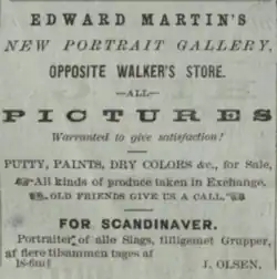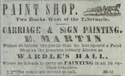 As he began his career as a photographer,[1][2][9] he also participated in various other economic activities such as selling fruit and groceries.[1] He advertised the opening of his new photography galley in July 1865.[1][6][7][9][14] The gallery was located opposite of the Walker's Store, on the west side of East temple between first and second south in Salt Lake City.[1][14] He focused primarily on portrait photography, which were printed on Cartes de visite, which were approximately the size of a business card.[1][6] He also sold other items such as fruit, confectionery, and groceries at his store.[6] He took several prominently known photographs of the new tabernacle, including a series of panoramic views of the Salt Lake Valley from the top of the tabernacle in 1867.[1] By early 1874, advertisements for his photography business largely disappeared from local newspapers and city directories,[1][6] likely due to competition from other prominent photographers in the region.[1]
