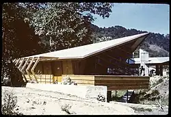 Drawing inspiration from Wright, Oribin adapted the Wright's concept for his Unitarian Meeting House to the Whitfield site and the Cairns climate, utilising local materials. Like Wright's design, the studio was designed to a triangular module, in this case using a 30°/60° grid that fans out towards the south-east. The building was raised up on a concrete and stone base, above the potential flood levels of the adjacent creek, with the access walkway from the house passing beneath the cantilevered studio and up a series of concrete steps on the southern and western sides. The heaviness of the concrete structure, which features large random stones, provided a visual anchor to the soaring characteristics of the studio above. Glazed walls with diagonal glazing bars angled back from a weatherboard "prow" and a sheet metal-clad roof with pointed ends and deep eaves sailed over the whole structure. Side casement windows, protected by shutters, provided cross-ventilation and surrounding trees and vegetation helped shade the studio as they grew. The glazed walls of the drawing office provided good, consistent daylight and views towards the house and Heavey Crescent.[1]