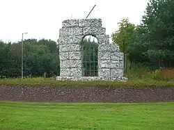 The 1828 map marks this building as 'offices', however it clearly served the function of coach house and stables for coach horses as well. It was also known as 'Adam's Block'.[11] More stables were built in the 1890s for the farm carthorses. Some of the dressed stone blocks from which the old stables and offices are constructed have masons marks cut into them. This suggests that they were taken from the ruins of Kilwinning Abbey in 1792 when one of the Earls had the stables built on the site of a 16th-century cottage. Ness[11] states that the stone came from a building called 'Easter Chaumers' which was part of the abbey. The design of the Montgomerie family crest above the entrance is identical to that on the castle ruins. The architect John Paterson built both, one being the 'trial piece' for the other.[48] Kerelaw Castle near Stevenston contained many carved stone coats of arms taken from the old abbey, which was clearly seen as being a convenient source of dressed or ornately carved stone for many a 'new' building in 'old' Cunninghame. The stables at Rozelle House in Ayr bear a more than passing resemblance to those at Eglinton.[49]