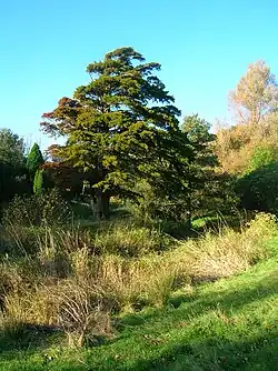 The curtain walls of the Walled Kitchen Garden with two roofless Gazebos or temples survive. One was used as a resting parlour and the other was an aviary.[27] They were both topped with statues as shown in surviving photographs. A handsome gate of cast-iron stood at the end of the bridge and its pilasters had two of the four statues representing the four seasons, the other two being on the temples.[27][38] Loudon in 1824 comments the trees of the park are large, of picturesque form and much admired. The kitchen garden is one of the best in the country. The park trees were mainly beech, with oak and elm also present. An article in 1833 in the Gardeners' Magazine makes similar remarks and comments on the ... many hundred feet of hot houses; however, it also notes that the ... grounds are not kept up as they ought to be.[39] A hedge maze or labyrinth existed in the grounds up until the 1920s.[25]