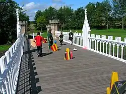 A croquet lawn existed on the northern terrace, between the castle and the Lugton Water, also the old site of the marquee for the tournament banquet. The 13th Earl developed a variation on croquet named 'Captain Moreton's Eglinton Castle Croquet', which had small bells on the eight hoops 'to ring the changes', two pegs, a double hoop with a bell and two tunnels for the ball to pass through. In 1865 the 'Rules of the Eglinton Castle and Cassiobury Croquet' was published by Edmund Routledge. Several incomplete sets of this form of croquet are known to exist and one complete set is still used for demonstration games in the West of Scotland.[43] It is not known why the earl named it thus.[44]