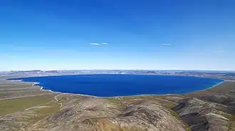 Lake Elgygytgyn is an impact crater lake located in the Anadyr Plateau, part of the Anadyr Highlands. It is drained to the southeast by the Enmyvaam, a tributary of the Belaya. It is approximately 12 km (7 mi) in diameter and has a maximum depth of 174 ± 2 m (571 ± 7 ft). The lake is centered within an impact crater with a rim diameter of 18 km (11 mi) that formed 3.6 million years ago during the Pliocene.[1] Before it was reliably dated, preliminary papers in the late 1970s suggested either Elgygytgyn[2] or Zhamanshin[3] as the source of the young Australasian strewnfield.