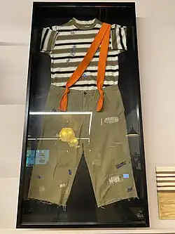 El Chavo is freckled and wears a green checkered cap with visor and earmuffs, a patched white T-shirt with brown and yellow horizontal stripes, brown pants held up by two red suspenders over his left shoulder, and black shoes, a gift from La Chilindrina. with yellow laces.[2]