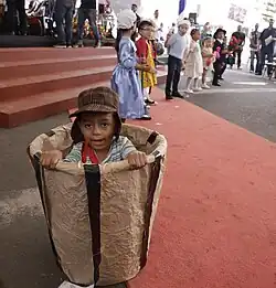 El Chavo del Ocho ("The Kid/Boy from number Eight", Spanish chavo also meaning "cent") or El Chavo is a Mexican fictional character and the protagonist of the Mexican television sitcom series of the same name. He was played by Roberto Gómez Bolaños (Chespirito), despite the obvious age difference between the actor and the character, and in the animated series his voice is played by Jesús Guzmán. In the English dub version of the animated series, he is voiced by Mona Marshall. Chavo means "boy" in colloquial Mexican language, his real name is unknown. He is very enthusiastic, creative and well-meaning, but also very innocent, which is why other children take advantage of him. He's not very bright and he's a bit clumsy. It is said that he came to the neighborhood at the age of four and apparently lives in apartment #8, it is not known with whom exactly, but it is said that an old woman took care of him in her apartment until she died.[1]