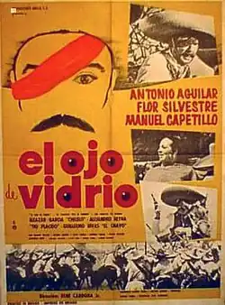 El ojo de vidrio (The Glass Eye) is a 1969 Mexican revolution-epic film directed by René Cardona Jr., starring Antonio Aguilar, Flor Silvestre, Manuel Capetillo, Eleazar García, Alejandro Reyna and Guillermo Rivas. With a backdrop of the Mexican Revolution, the film recounts the story of former horse wrangler and bandit Porfirio Alcalá y Buenavista, who becomes the subject of a popularly known corrido along with his four cousins, after being notoriously heroic for raiding rich landlords and helping the poor. Being each notable for having one eye as the result of an injustice, the five heroes meet two townswomen and a theater actor who helps them disguise for their various raids. As their last raid attack, they take vengeance to the man who caused their tragedy, and evade revolutionary troops who call for peace after Porfirio Díaz resigns and is exiled.