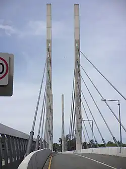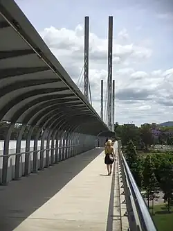 The Eleanor Schonell Bridge, better known as the Green Bridge, is a 390-metre (1,280 ft)-long cable-stayed bridge which crosses the Brisbane River between Dutton Park and the University of Queensland's St Lucia campus, connecting the UQ Lakes and Dutton Park Place busway stations. Its deck is 185 metres long, 20 metres wide and about 18 metres above the river's surface. The bridge was opened on 17 December 2006, and is the first bridge in Australia exclusively designed for buses, cyclists and pedestrians.[2] The bridge cost $55.5 million to construct.[3]