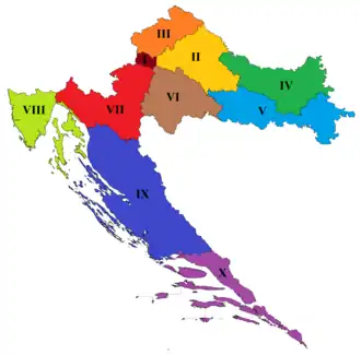 The first ten districts are roughly based on geography, but shaped according to the number of voters so that each district holds roughly the same number of registered voters, around 400,000.[2] These districts therefore do not correspond to the borders of top administrative divisions within Croatia and each district contains one or more or parts of several Croatian counties.