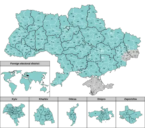 | 41 | Donetsk Oblast | Parts of: Donetsk | 151,531 | | | | Donetsk | 🌍 | ED #41 on voters register website Archived 2021-10-29 at the Wayback Machine |