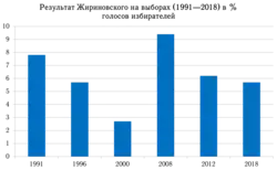 Vladimir Zhirinovsky   Vladimir Zhirinovsky's results in the presidential elections from 1991 to 2018    Electoral history of Vladimir Zhirinovsky  , Member of the State Duma  (1993–2022), Deputy Chairman of the State Duma  (2000–2011) and  Leader of Liberal Democratic Party  (1991–2022). Liberal Democratic presidential candidate 1991 , 1996 , 2000 , 2008 , 2012  and 2018 .