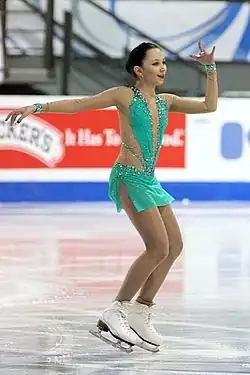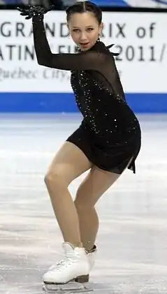 According to ISU age rules, Tuktamysheva was eligible for the senior Grand Prix circuit during the 2011–12 season, although not for senior ISU Championships. She was assigned to two Grand Prix events, the 2011 Skate Canada International and 2011 Trophée Éric Bompard. Tuktamysheva replaced the injured Sarah Meier at the Japan Open in October and won the event.[32][33] Tuktamysheva debuted on the senior Grand Prix circuit at Skate Canada International,[34] where she won the gold medal with a combined personal best score of 177.38 points, becoming the youngest champion in the event since Tracey Wainman in 1981.[35] She dedicated the win to her late father.[9] Tuktamysheva then won gold at 2011 Trophée Éric Bompard to qualify for her first senior Grand Prix Final. She is the first ladies' skater to win her senior debut event and to win both events in her senior Grand Prix debut.[36] At the Grand Prix Final, she finished fourth with a combined total of 174.51 points.