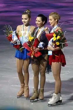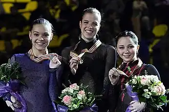 Elizaveta Sergeyevna Tuktamysheva (/ˌtʊktəˈmɪʃəvə/ TUUK-tə-MISH-ə-və;[1] Russian: Елизавета Серге́евна Туктамышева, IPA: [jɪlʲɪzɐˈvʲetə tʊktɐˈmɨʂɨvə]; born 17 December 1996) is a Russian figure skater. She is the 2015 World champion, the 2021 World silver medalist, the 2015 European champion and the 2013 European bronze medalist. She has medaled 16 times on the Grand Prix series, including 5 gold medals and including gold at the 2014–15 Grand Prix Final and bronze at the 2018–19 Grand Prix Final. On national level she is an 8-time medalist in the Russian Championships and the 2013 Russian national champion, as well as 4-time medalist in the Russian Cup Finals. On the junior level, she is the 2012 Youth Olympic champion, 2011 World Junior silver medalist, and 2010–11 JGP Final silver medalist.