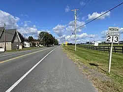 MD 213 enters the town of Elkton at the intersection with US 40 (Pulaski Highway).[1] Past this intersection, the route heads northwest on Bridge Street, passing through commercial areas as a three-lane road with a center left-turn lane. The route narrows to two lanes before it crosses Big Elk Creek and intersects Main Street, which continues east of MD 213 as a one-way street eastbound.[1][4] Past Main Street, the road heads north and passes over Amtrak's Northeast Corridor railroad line before intersecting MD 545 (Elkton Boulevard). MD 213 continues past commercial areas to the west and residential areas to the east as a three-lane road with a center left-turn lane before its junction with MD 279 (Newark Avenue).[1][4] Past the MD 279 junction, the route narrows back to two lanes before it leaves Elkton and becomes Singerly Road, which continues past residences. MD 213 enters a mix of woods and farms and passes over Interstate 95 (John F. Kennedy Memorial Highway) without an interchange and CSX's Philadelphia Subdivision railroad line within a short distance of each other. It continues through a mix of farms and residences before the road reaches the Leeds roundabout with Leeds Road/Elk Mills Road west of the community of Cherry Hill. Past the roundabout, the route resumes north, intersecting MD 273 (Telegraph Road) in the community of Fair Hill west of the Fair Hill Training Center and the Fair Hill Natural Resources Management Area, where the Atlantic to Appalachians Scenic Byway leaves MD 213 and heads west along MD 273.[1][3][4] From here, the name of MD 213 changes to Lewisville Road and it curves northwest and north through a mix of rural areas and residences before ending at the Pennsylvania border. Here, the road continues north into that state as PA 841 (Chesterville Road) and reaches the community of Lewisville, intersecting the southern terminus of PA 472 (Lewisville Road) just north of the state line.[4]