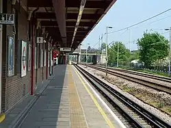 The station consists of a central island platform—numbered 1 for westbound and 2 for eastbound—between the tracks.[26] There are four tracks through the site although there are no platforms for the London, Tilbury and Southend line.[27] The platforms are 700 feet (210 m) in length with the 400 feet (120 m) section currently in operational use under a single canopy supported by a row of central columns.[27] There are central platform buildings, including a waiting room and public toilet.[27][28][29]