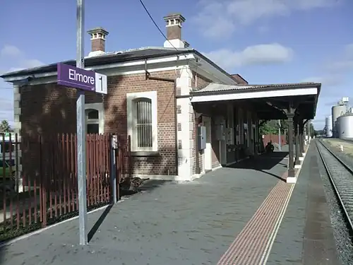 Elmore railway station is located on the Deniliquin line in Victoria, Australia, and serves the town of the same name. The station opened on 19 September 1864 as Runnymede, but was renamed Elmore on 1 November 1876.[2]