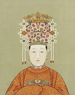 Lady Wang lived in seclusion and isolation within the Forbidden City, neglected by the emperor. Even her own son was rarely allowed to visit her.[3] Despite being the emperor's eldest, he was not immediately named as heir to the throne. Instead, the Wanli Emperor and Lady Zheng favored Zhu Changxun, while government officials and the emperor's mother advocated for Zhu Changluo's appointment. It was not until 1601, after prolonged disputes and discussions, that Zhu Changluo finally became the designated heir.[1][4] Five years later, in 1606, after the birth of Zhu Changluo's first son (the future Tianqi Emperor), Lady Wang was finally granted the title of Imperial Noble Consort (Huang Guifei),[1][5] a fitting recognition for the mother of an heir.[5]