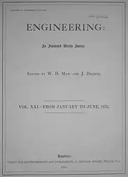 Engineering was initially published as an illustrated weekly magazine, edited by Zerah Colburn, with volumes published twice yearly in January and July. Volume 1 was issued 1866.[1]