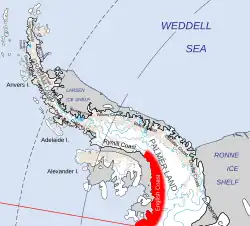 The English Coast is divided between Palmer Land on the Antarctic Peninsula and Ellsworth Land to the south and west.