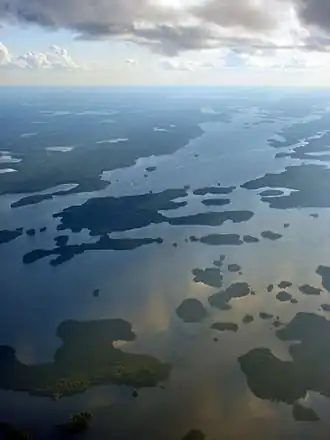 The English River is a river in Kenora District and Thunder Bay District in Northwestern Ontario, Canada.[3] It flows through Lac Seul to join the Winnipeg River at Tetu Lake as a right tributary.[4] The river is in the Hudson Bay drainage basin, is 615 kilometres (382 mi) long and has a drainage basin of 52,300 square kilometres (20,200 sq mi).[2] Although there are several hydroelectric plants on this river, the English River upstream of Minnitaki Lake is notable as one of the few large river systems in northwestern Ontario with a natural flow and without any upstream source of pollution.[5] It is the fourth longest river entirely in Ontario.