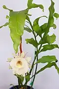 Epiphyllum oxypetalum, the Dutchman's pipe cactus,[3] princess of the night or queen of the night,[4] is a species of cactus with a native range from Mexico to Nicaragua.[5] It blooms nocturnally, and its flowers wilt before dawn. Though it is sometimes referred to as a night-blooming cereus, it is not closely related to any of the species in the tribe Cereeae that are more commonly known by that name. All Cereus species bloom at night and are terrestrial plants; Epiphyllum species are usually epiphytic.
