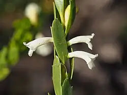 The flowers appear singly or in pairs in leaf axils on stalks 1–3.5 mm (0.04–0.1 in) long. There are 5 narrow triangular, glabrous green sepals, 1–2 mm (0.04–0.08 in) long. The petals are 6–10 mm (0.2–0.4 in) long and joined at their lower end to form a tube. The petal tube is white to cream-coloured, glabrous on the outside but the inside of the tube is filled with long soft hairs and the top of the bottom lobe is also hairy. The 4 stamens are fully enclosed in the petal tube. Flowering occurs mostly from July to December and is followed by fruits which are oval-shaped, glabrous and about 1 mm (0.04 in) long.[2][3]