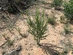 Eremophila compressa is an erect, open shrub which usually grows to between 0.8 and 2 m (3 and 7 ft) high with branches that are glabrous but have many warty lumps and are sticky towards their ends due to the presence of resin. The leaves are arranged alternately and point upwards so that they often obscure the branches. They are green, often with a purple tinge, elliptic to egg-shaped, mostly 8–16 mm (0.3–0.6 in) long, 2–7 mm (0.08–0.3 in) wide, and have 2 or 3 prominent teeth near their ends.[2][3]
