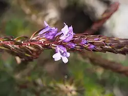 The flowers are borne singly in leaf axils. There are 5 lance-shaped greenish-coloured sepals which are 3.5–6.5 mm (0.1–0.3 in) long. The petals are 9.5–14 mm (0.4–0.6 in) long and joined at their lower end to form a tube. The outside of the petal tube is a shade of purple to lilac-coloured and the inside is white with purple spots. The petal tube is usually mostly glabrous except for the lower petal lobe and the inside of the tube which have long, soft hairs. The 4 stamens are enclosed in the petal tube. Flowering time differs between subspecies but in each case is followed by fruits which are dry, oval shaped and 2.5–3 mm (0.1–0.1 in) long.[2][3]