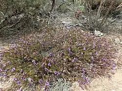 - Eremophila densifolia F.Muell. subsp. densifolia[2][7] which is a densely branched, prostrate shrub with glabrous leaves, sepals that lack glandular hairs near their tips and a petal tube that is glabrous on the outside, flowering September to December;[8][3]