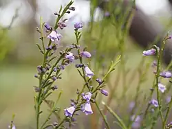 The flowers are borne in groups of 3 to 5 in leaf axils on a stalk which is 2–5 mm (0.08–0.2 in) long and sticky when young. There are 5 overlapping, egg-shaped to lance-shaped, brownish sepals which are 2–3.5 mm (0.08–0.1 in) long. The sepals are glabrous except for the long hairs on their edges, are sticky and remain on the plant long after flowering has finished. The petals are 5–9 mm (0.20–0.35 in) long and joined at their lower end to form a tube. They are a shade of violet to lilac-coloured, rarely white on the outside and white with violet spots inside the tube. The petal lobes are hairy on the outside and have short, flattened hairs on the inside. The petal tube is mostly glabrous on the outside while the inside of the tube is filled with long, spidery hairs. The 4 stamens are fully enclosed in the petal tube. Flowering occurs from August to November and is followed by fruit which are oval-shaped, hairy and 2–3 mm (0.08–0.1 in) long.[2][3][5]