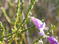 Eremophila homoplastica is a flowering plant in the figwort family, Scrophulariaceae and is endemic to Western Australia. It is a small shrub with many fine, tangled branches, tiny leaves and purple to lilac-coloured flowers.