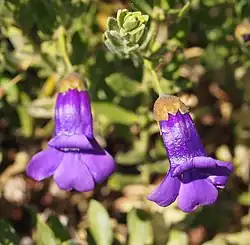 The flowers are borne singly in leaf axils on a hairy stalk usually 4–26 mm (0.2–1 in) long. The sepals are joined to make a bell-shaped tube 6–9 mm (0.2–0.4 in) with unequal lobes. The surface of the sepal tube is variable, sometimes glabrous or more or less covered with glandular hairs. The petals are mostly 27–38 mm (1–1 in) long and are joined at their lower end to form a tube. The petal tube is usually deep reddish-violet to purple on the outside, but sometimes pink or white. The inside of the tube is white with small violet spots. The outside surface of the petal tube and the inside surface of the lobes are glabrous and shiny but the inside of the tube is filled with long, soft hairs. The 4 stamens are enclosed in the petal tube. Flowering mainly occurs between May and October and is followed by fruits which are dry, oval-shaped to almost spherical with a hairy, papery covering and are usually 9–15.5 mm (0.4–0.6 in) long.[2][3][4]