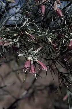 The flowers are borne singly or in pairs in leaf axils on stalks 4–7 mm (0.2–0.3 in) long and covered with silvery-grey scales. There are 5 narrow triangular sepals which are scaly on the outer surface, hairy on the inside and 2.5–6.5 mm (0.1–0.3 in) long. The petals are 20–25 mm (0.8–1 in) long and joined at their lower end to form a tube. The petal tube is a pink to a dull brick-red, sometimes yellow. The outside surface is scaly and the inside of the petal lobes is hairy but the inside of the tube is filled with soft hairs. The 4 stamens extend slightly beyond the end of the tube. Flowering is followed by fruits which are dry, cylinder-shaped, 13–16 mm (0.5–0.6 in) long and have a papery covering.[2]