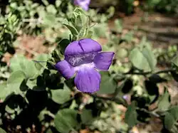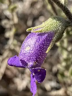 The flowers are usually borne singly in leaf axils on a hairy stalk which is usually 1–3.5 mm (0.04–0.1 in) long. There are 5 narrow-triangular, green sepals which are mostly 8.5–11 mm (0.3–0.4 in) long. The outside surface of the sepals has similar yellowish hairs to those on the leaves while the inside surface has mostly glandular hairs. The petals are 18–28 mm (0.7–1 in) long and are joined at their lower end to form a tube. The petal tube is purple on the outside and white with purple spots inside the tube. The outer surface of the petal tube is covered with star-shaped hairs, but the inner surface of the lobes is glabrous while the inside of the tube is filled with long, woolly hairs. The 4 stamens are fully enclosed in the petal tube. Flowering occurs between April and October and the fruit which follow are oval to conical in shape, 6.5–8 mm (0.26–0.31 in) long and thickly covered with branched white hairs.[2][3]