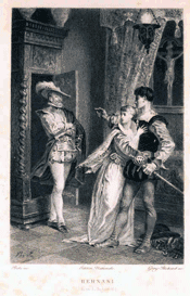 ...from the first the spirit of Hugo is there. Verdi [ten years younger than the playwright] was part of that youthful audience to which the play Hernani is addressed. The bounding energy of Hugo's alexandrines is reflected in the spirit of Verdi's music, which is far more forceful than anything he had written so far. Victor Hugo, one might say, was good for Verdi; and it significant that both the operas that he based on Hugo's plays (the other was of course Rigoletto) were landmarks in his career.
