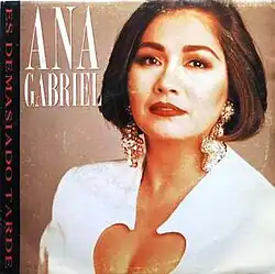 "Es Demasiado Tarde" ("It's Too Late")[1] is a song written and performed by Mexican singer-songwriter Ana Gabriel. It was released in 1990 by CBS Records and first included on the compilation album México, Voz y Sentimiento which also featured songs performed by Luis Angel, Vikki Carr, Aida Cuevas, Lorenzo de Monteclaro, Antonio De Jesús, Pedro Fernández, Hermanas Huerta, Tania Libertad, Angelica Maria, Lucía Méndez, Angeles Ochoa, Gilberto Parra, Gerardo Reyes, Cuco Sánchez, Cecilia Toussaint, Yuri and Flor Yvon.[2] The song became Gabriel's fourth number-one single in the Billboard Top Latin Songs chart, after "Ay Amor", "Simplemente Amigos" and "Quién Como Tú".[3] Personalidad: 20 Éxitos was the first Gabriel album to include the song.[4] "Es Demasiado Tarde" is a song about a woman who refuses to take her lover back after the end of their relationship.[1] Gabriel also addressed this issue in her song "Tú lo Decidiste" ("You Made the Decision") in 1994.[1] The song earned the Lo Nuestro Award for Best Pop Song.[5]