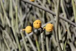 The plant consists of slender and grey stems growing up to a height of 2.5 meters.[2] Yellow-brown capsules appear at the tips of the plant during the fruiting season.[2] The plants may not bear fruit as individual plants are either male or female.[2]