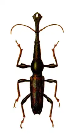 Eutrachelus temmincki is the largest species in the family Brentidae and has one of the longest snouts among beetles. These giant weevils can reach a length of 55–75 millimetres (2.2–3.0 in) in males (including snout), while females are smaller (about 65 mm.), with a narrower head and snout. Body is elongated, with a long snout and more or less developed jaws. The basic color is black with small orange to red spots on the elytra.