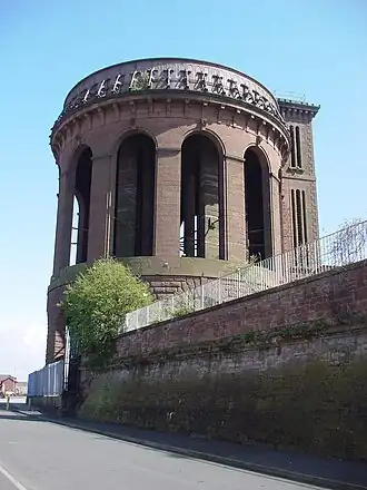 Designed by the Liverpool's first water engineer, Thomas Duncan, it is all that is visible of the 1.5-acre (0.61 ha) 12 feet (3.7 m) deep water service reservoir. The masonry hides a cast iron tank 90 feet (27 m) above ground level.[2][3][4]