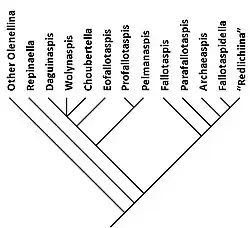 Repinaella is closest to the common ancestor with the other Olenellina. Second to split away is the Daguinaspididae-family, which comprises the closely knit group of Choubertella, Daguinaspis and Wolynaspis, with Eofallotaspis slightly further removed, and near the basis a subgroup consisting of Profallotaspis and Pelmanaspis. The monotypical family Fallotaspididae is next to branch-off. This is followed by the branch of Parafallotaspis all on its own, followed by the monotypical family Archaeaspididae. Finally Fallotaspidella is closest to the trilobites with dorsal cephalic sutures, such as Bigotina and Lemdadella.[1]