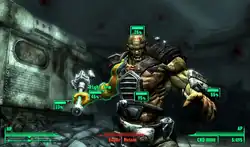 At the beginning of the game, the player can customize their character's physical appearance by choosing their gender and race.[4][5] They can then allocate points into seven primary attributes: strength, perception, endurance, charisma, intelligence, agility, and luck.[5] These attributes are known as S.P.E.C.I.A.L. stats, and range from 1 to 10.[3]: 4 Additionally, there are 13 secondary attributes whose point totals are affected by S.P.E.C.I.A.L. stats: barter, big guns, energy weapons, explosives, lockpick, medicine, melee weapons, repair, science, small guns, sneak, speech, and unarmed.[3]: 10 If the player has a high charisma stat for example, then they will be more proficient with the barter and speech skills at the beginning of the game.[3]: 6 The player can add more points into skill stats whenever they earn enough experience points to level up.[5] Experience points can be earned through several methods, such as killing an enemy or completing a quest.[6] When the player reaches a new level, they can select a perk, which is a permanent beneficial upgrade.[5] For example, the perk Master Trader reduces the price of items sold by vendors by 25 percent.[3]: 18