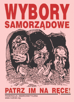 FA has stated their anti-parliamentary policies and boycotting activities derive from ideals of Pierre-Joseph Proudhon, Mikhail Bakunin and Peter Kropotkin.[a][23] FA will release anti-election posters, and leaflets in protest of Polish and international elections, being particularly critical of representative democracies.[24] On the topic of voting, FA has stated, "The whole truth about voting can be summed up in one sentence: by voting, you give others power over yourself. By choosing one or many masters, whether for a short or long time, you give up your own freedom".[25] These leaflets are predominately posted online, often with the phrases:[24]