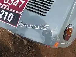 There was also a very rare Zagato Spyder version produced, only between two and four examples are believed to have been built.[10] This model was first shown at the 1957 Turin Auto Show, and it was then shown again the next year.[10] The design has the usual sleek Zagato front end, with distinct fins at the rear. The bump on the engine lid came in for some period critique for disfiguring the overall design.[11] Max power from Abarth's 747 cc (45.6 cu in) engine is 44 CV (32 kW; 43 hp), enough for a top speed of 153 km/h (95 mph) in a period road test or 145 km/h (90 mph) according to Abarth themselves.[10][11][12] The Spyder's list price in Italy was the same as for the berlinetta Zagato, 1,535,000 Lira in 1958.[4] The 1958 Turin Show car had the twin cam engine, with similar performance to the berlinetta, although the "little castle" disfiguring the engine lid was even larger on this model.[13]